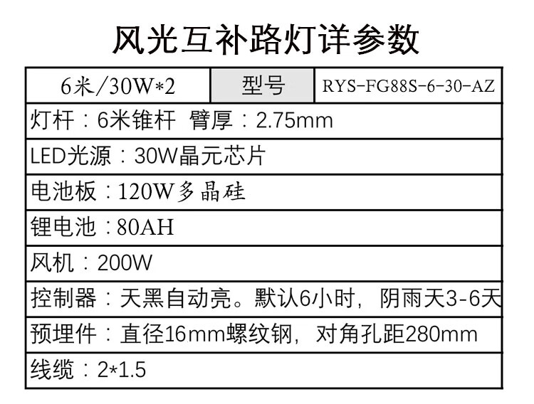 日月升 RYS-FG88S-6-30-AZ 太阳能风光互补路灯 锥杆灯杆6米 30W 双灯头(含风机)