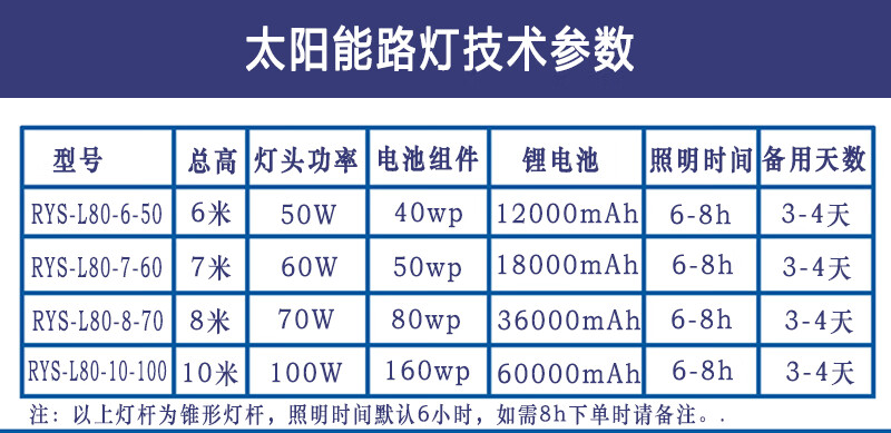 日月升 RYS-L80-6-50 太阳能路灯 6米 50W(含锥形灯杆) 自营